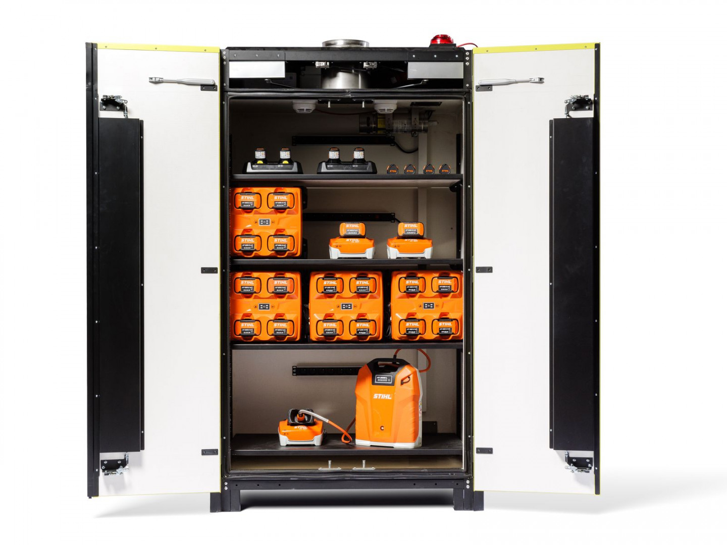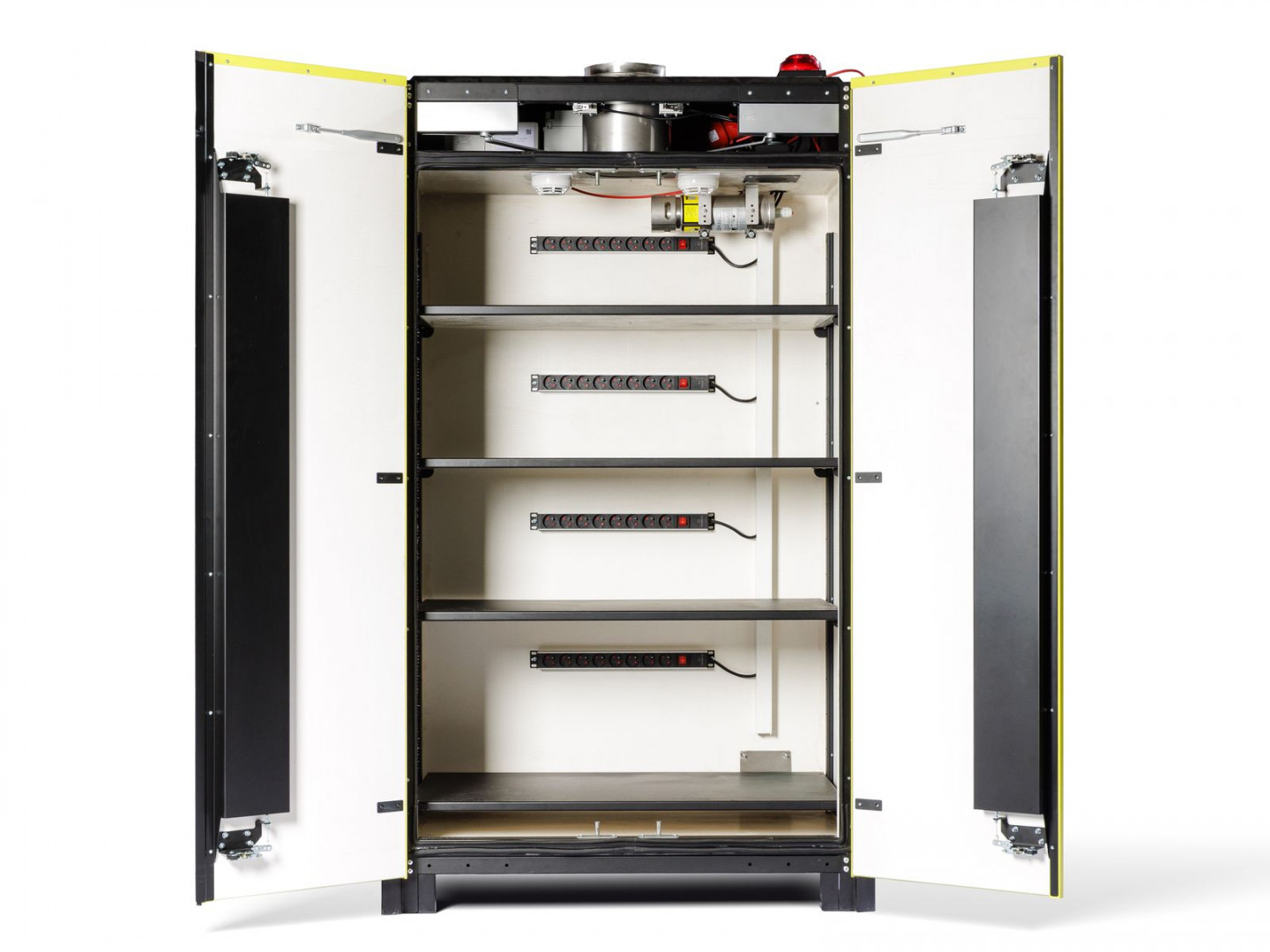 Úložná a nabíjacia skriňa je navrhnutá na bezpečné skladovanie a nabíjanie lítium-iónových batérií v interiéri. Primárne je určená pre batérie z elektrických bicyklov, e-kolobežiek, ručného/záhradného náradia, dronov a vysielačiek.